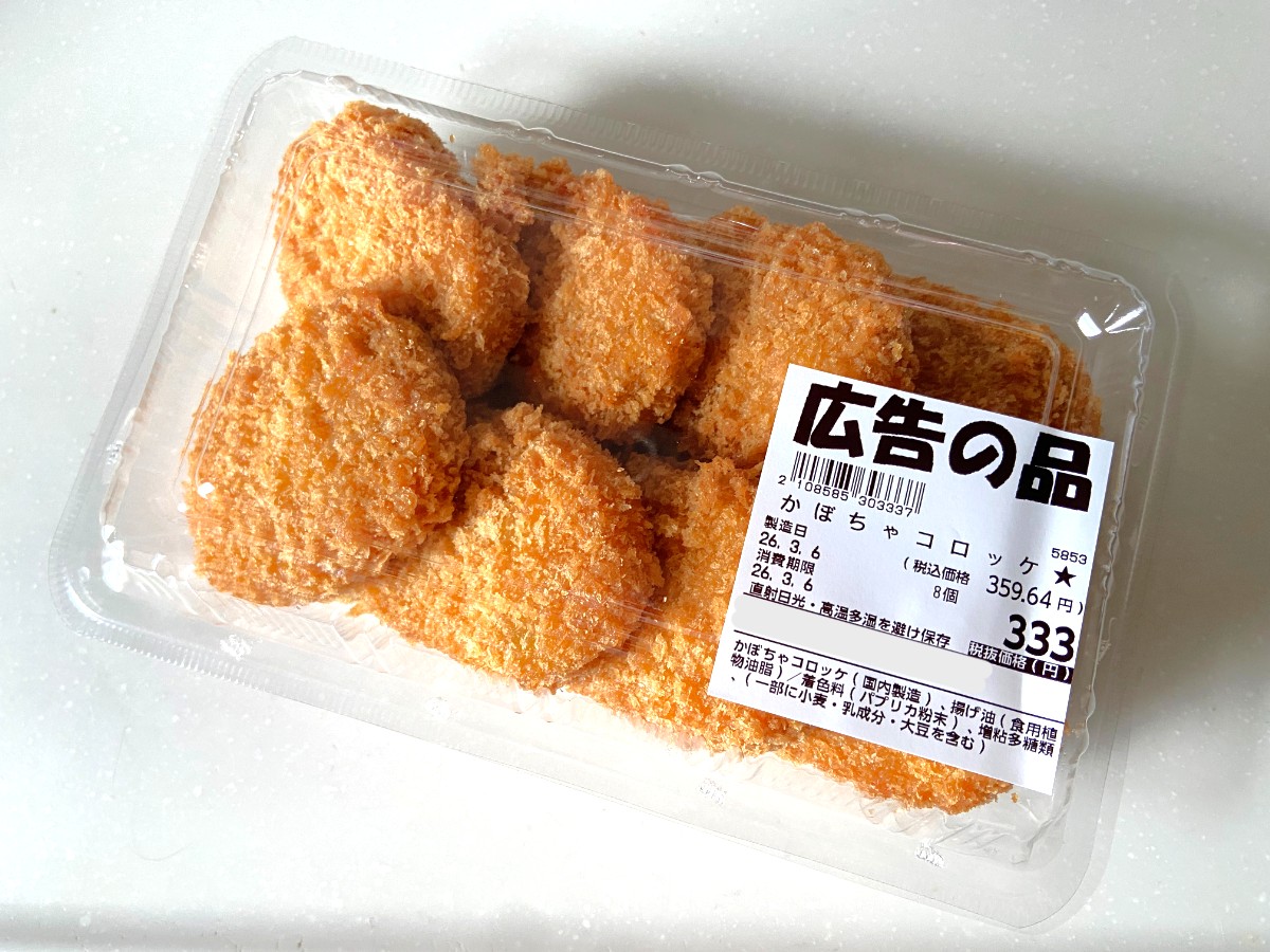 新作惣菜が、売り場に並んでいました。「かぼちゃコロッケ」(購入時:359円)です。シンプルなかぼちゃだけのコロッケは、なかなか他のスーパーで売っているところも少ないのではないでしょうか。