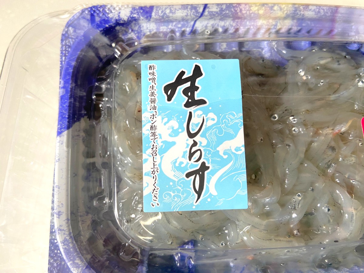 鮮魚コーナーで見つけて思わず手に取ったのが、「生しらす」(購入時:421円)です。生しらすは足が速く、鮮度が落ちるのがとにかく早いです。