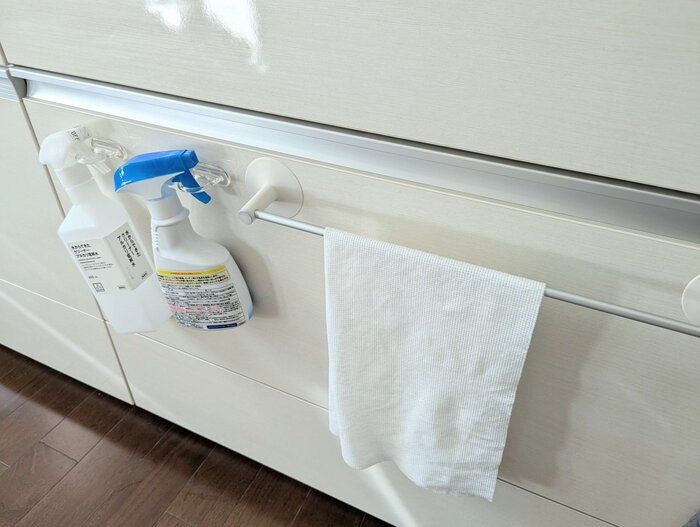 わが家では、「フィルムリングフック」(JANコード:4571336080722)をキッチン収納の引き出し前面に貼って、アルコールスプレーやアルカリ電解水のスプレーボトルを収納しています。耐荷重は1.5kgあるので、少し重さのあるものでも安心(リングを縦にして使う場合は2kgまでOK)。