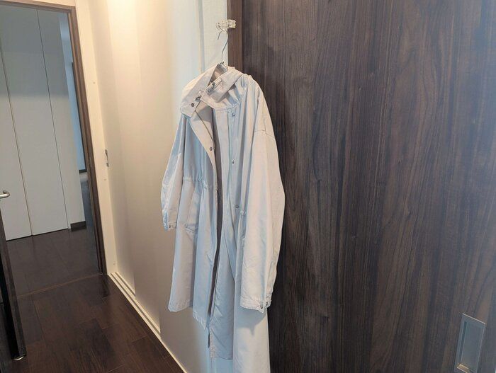 わが家では、リビング裏の引き戸の縦枠に設置。雨の日や来客時など、急きょアウターをかける場所が必要になったときの「臨時フック」として活用しています。ふだんは邪魔にならず、いざ必要になったときも場所を取らずに使えるのがとっても便利。