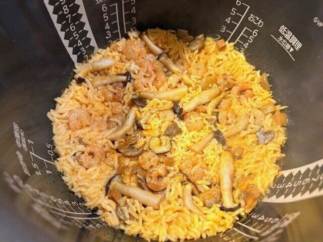 炊き上がりました!フタを開けた瞬間、魚介のとても良い香りがします。