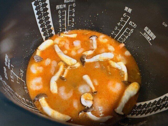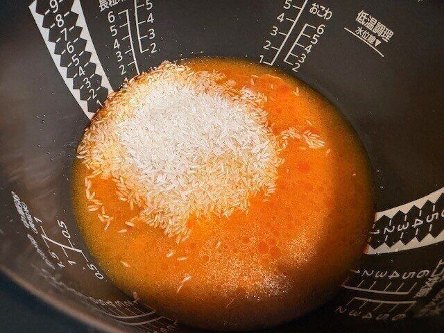 作り方は本当に簡単。調味料液を炊飯器に入れ、水を加えたら入っているインディカ米も洗わずにそのまま炊飯器の中へ入れます。