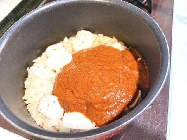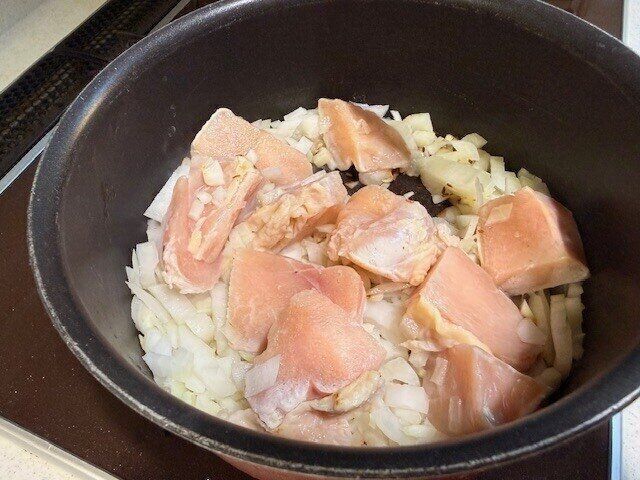 鶏肉と玉ねぎを加えて更によく炒めます。