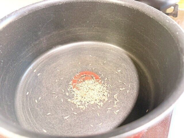 フライパンにサラダ油と炒め用のスパイスを入れ、スパイスの香りがたつまで炒めます。