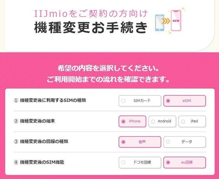 具体的には、IIJmioのサイトやアプリから手続きができるのですが、機種変更後の端末を準備し、eSIM再発行の申込み、SIMの設定、これだけで完了します。